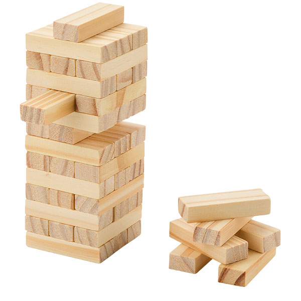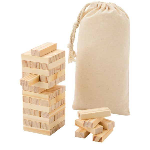 Wooden toppling tower. FSC certified pine wood. Supplied in cotton carrying pouch.