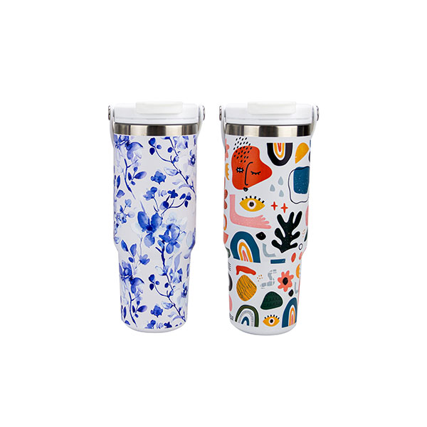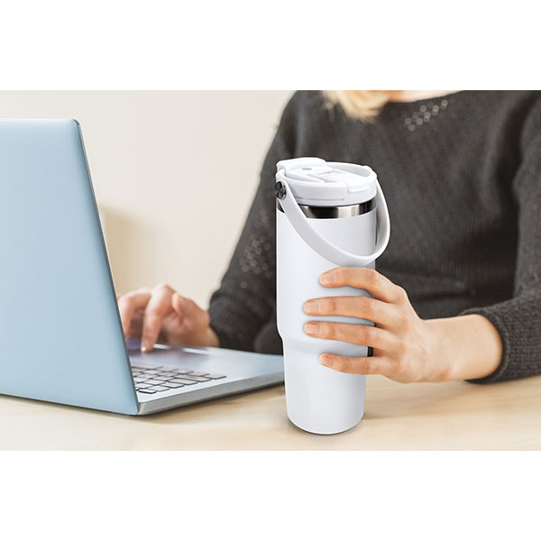 Titan Pro insulated steel tumbler. Capacity: 900ml. Keeps drinks hot for 6 hours and cold for 12 hours. Pop up straw and pop open sipping hole. Carry handle.