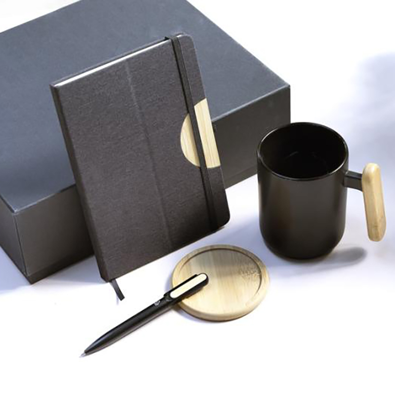 The Laura gift set includes an A5 RPET hard cover notebook, a ballpoint pen, a ceramic mug, and a coaster.