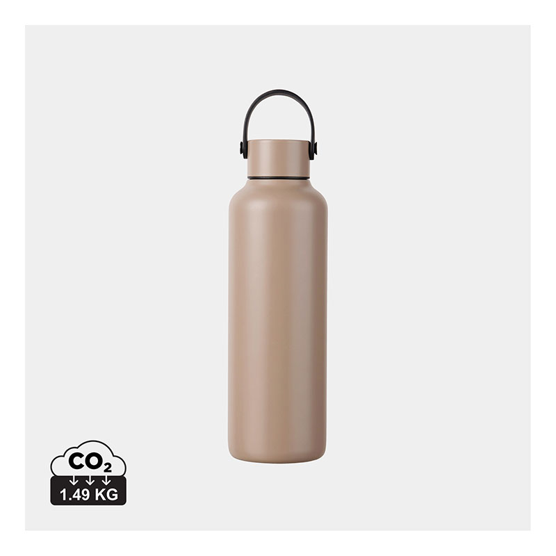 This double wall vacuum bottle, crafted from RCS certified recycled stainless steel, offers both performance and style. Designed with a minimalistic PU handle and black details that capture the essence of Baltimore series. The double walled insulation maintains drink temperatures cold for up to 12 hours, and hot for up to 6 hours, whether you need to stay cool with a chilled drink or enjoy a warm beverage on the go. Not dishwasher or microwave safe, only handwash.