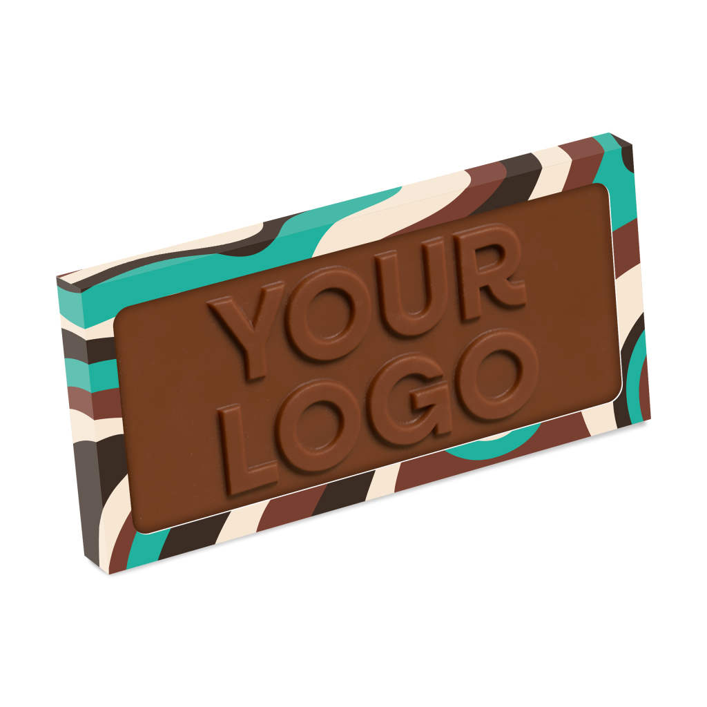 A custom 3D-moulded milk chocolate bar, flow wrapped in recyclable clear film and presented in a fully branded, eco-friendly window box. Perfect for showcasing your logo or design in delicious detail.