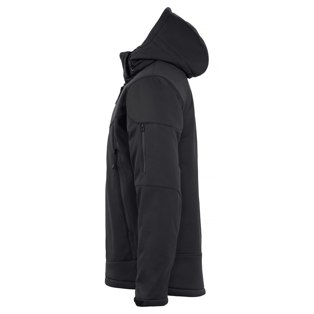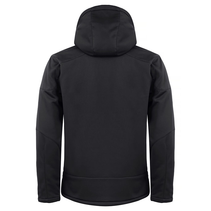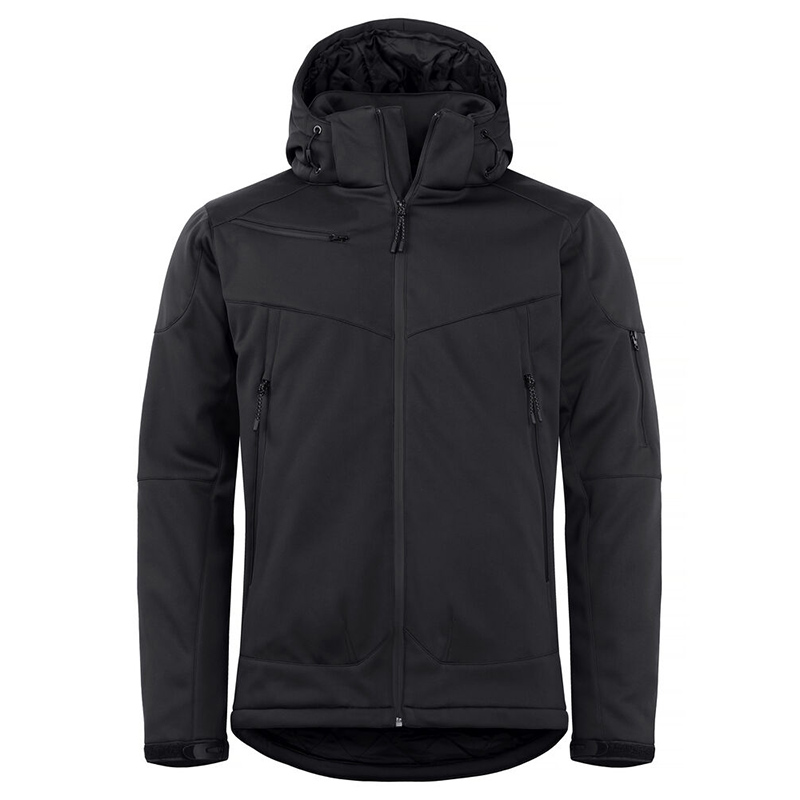 Comfortable and modern padded softshell jacket. A removable and adjustable hood. Pre-curved sleeve cuffs for ease of movement. Four outer pockets with waterproof zippers and two inner pockets one with zip and one mesh. All zippers are SBS quality. Velcro adjustable cuffs and reflective detail on back. Includes black lining and an embroidery zip.