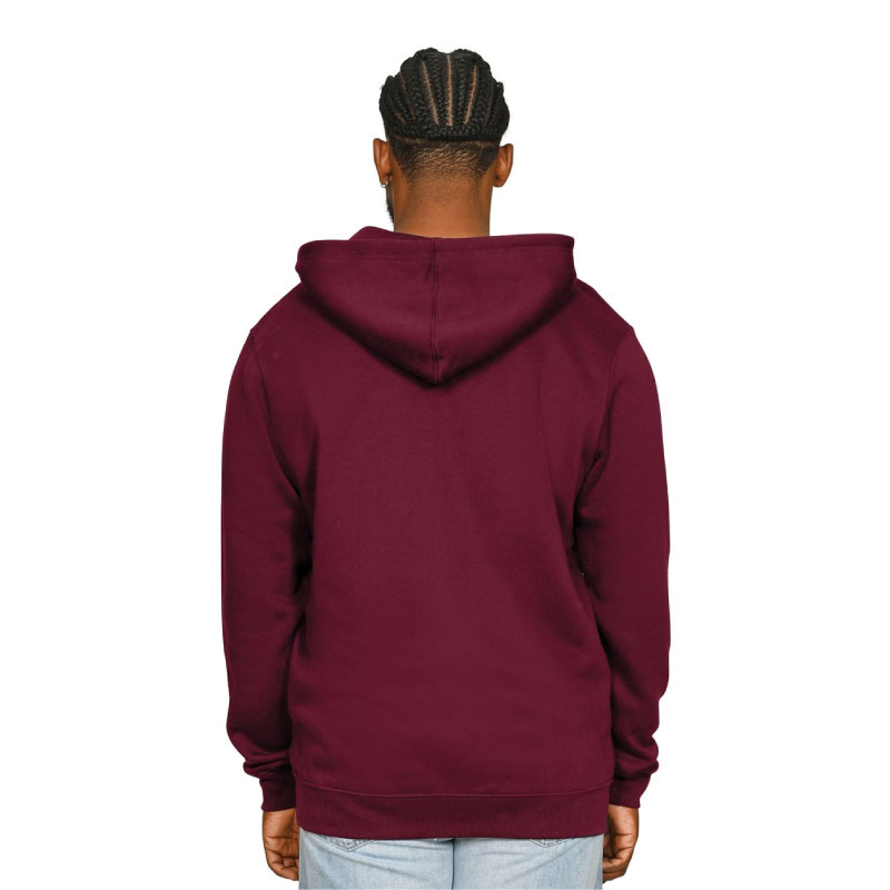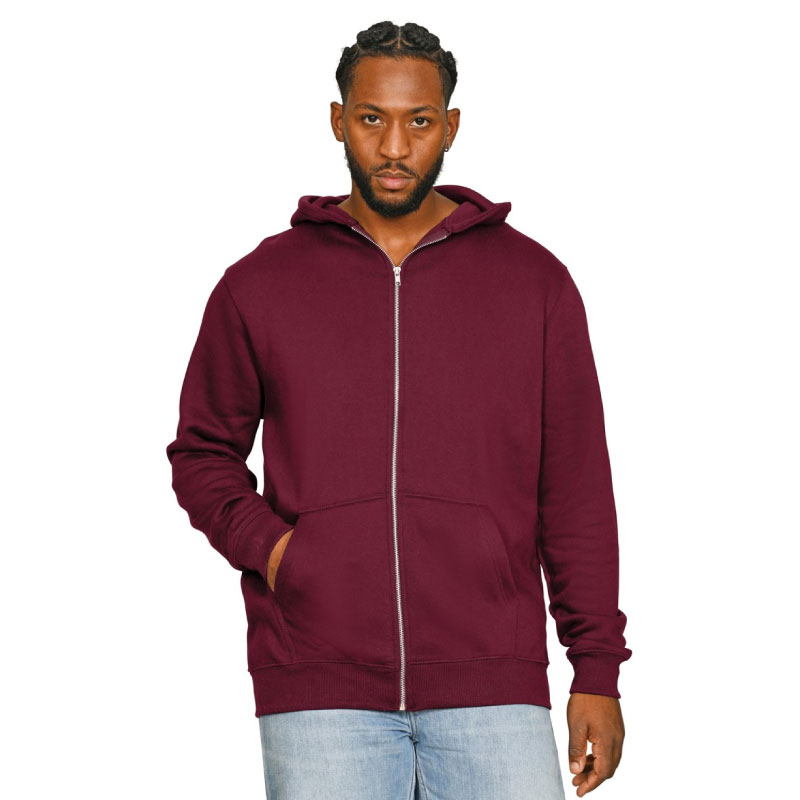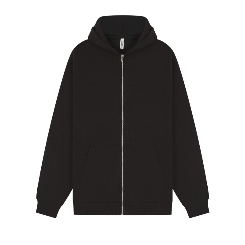 Three Thread Combed Ringspun Fleece, Brushed Back, Metal Exposed Zipper, Kangaroo Pouch Pocket, no drawcord in neck.