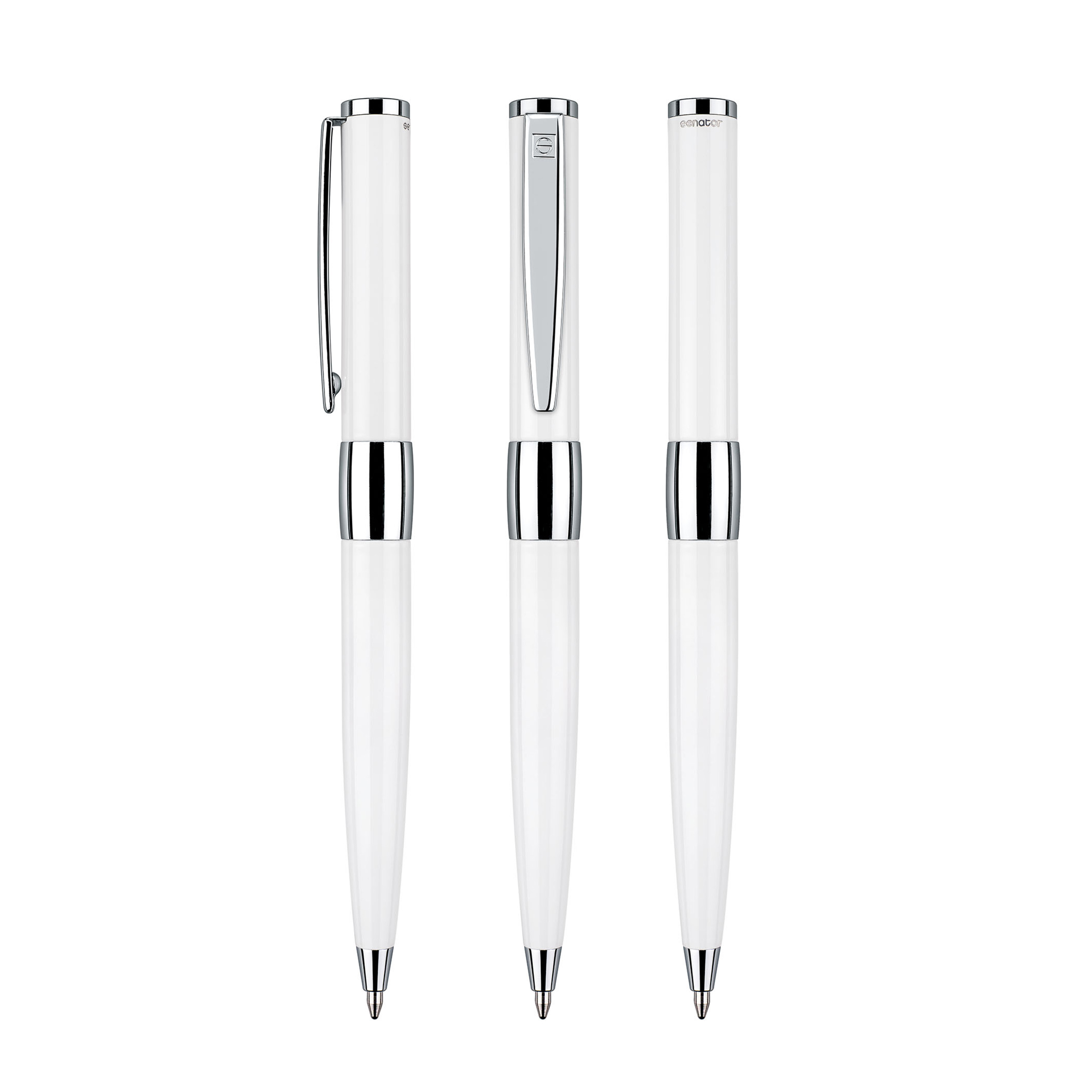 The "Image White Line" features a glossy white lacquered metal barrel and shiny chrome-plated fittings.
