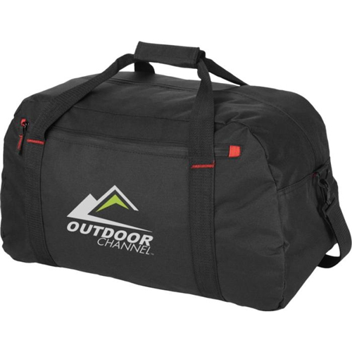 Large travel bag with zipper large main compartment, front zipper pocket and adjustable shoulder strap.