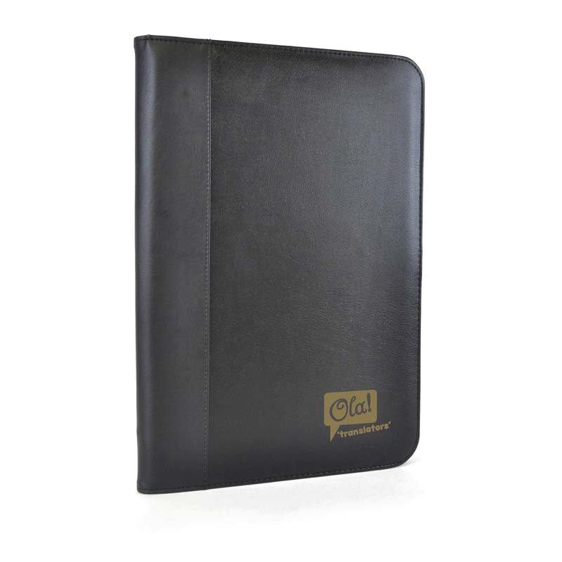 Oversized A4 zipped padded PU folder, with edge trim. Includes tablet holder, document holder, business card holder, elasticated pen loop, elasticated flash drive holder and 25 sheet lined notepad. Product can be printed up to 2 spot colour, transfer printed or debossed/foil blocked.