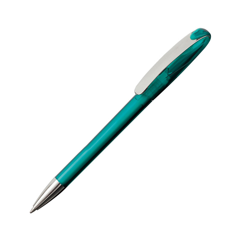 A translucent twist action ball pen with a metal nose cone and metal clip from Klio-Eterna.