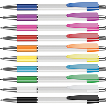Push-button ballpen with a coloured rubberised grip and matching opaque clip. The clip can also be personalised.