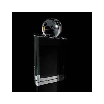 Crystal globe mounted onto a medium crystal chunky block with bevelled edges 180mm high supplied in a satin lined box. Large also available.