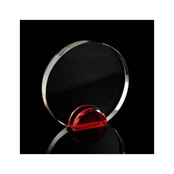 Medium optical crystal round award with red crystal facet stand 140mm high supplied in a satin lined gift box