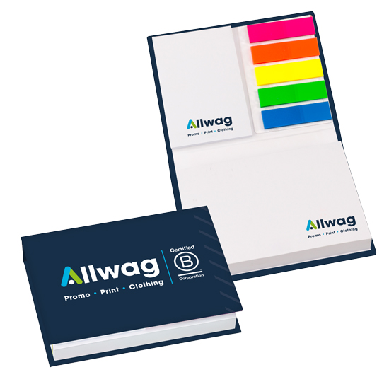 Upgrade the combi notes with a hard-backed cover, for an executive corporate gift at a great price. Includes 100 sheets (80g/m2) of sticky notes, size: 100x75mm, and 25 sheets (80g/m2) sticky notes, size: 50x75mm. Includes 5 sets of 20 neon coloured page markers. Cover is digitally printed with gloss or matt lamination.