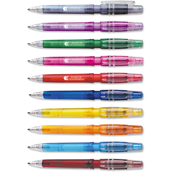 Status Clear Transparent Retractable Plastic Ball Pen. In Transparent Colours With Clear Transparent Nose Clip and Trim. Blue Ink Refill.