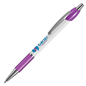 Retractable ballpen with a metal clip assembly and opaque rubberised grip. A mix and match service is available.