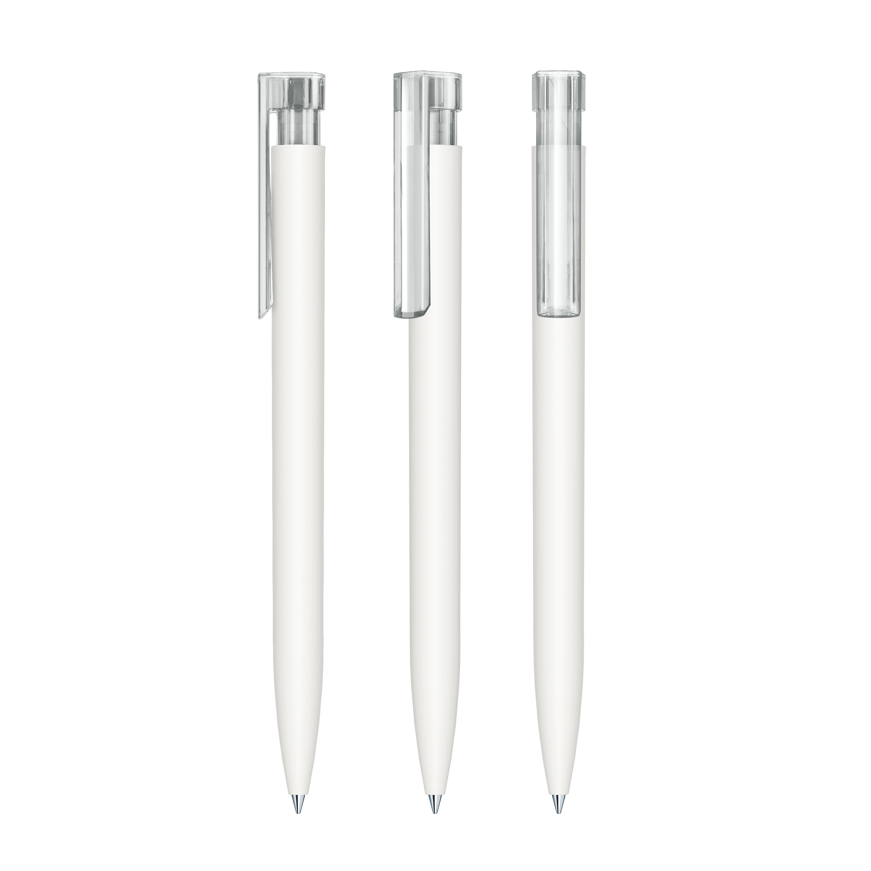 A transparent clip complements the clear design and adds a light accent.