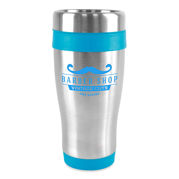 Ancoats stainless steel travel tumbler. Capacity - 400ml. Steel case with plastic inner. Coloured base, band and lid. Double walled construction with sliding sipper cover. Individually boxed. Bulk packed 50 to a carton.