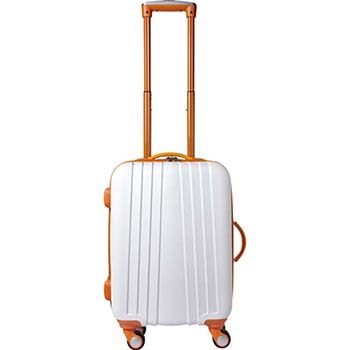 ABS trolley with four spinner wheels, a coloured, extendable metal handle, matching zipper and piping, and a metal lock.