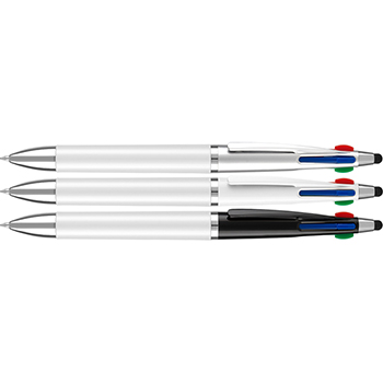Retractable Multi-Function ballpen with a capacitive stylus and 4 colour refills, black, blue, red and green.