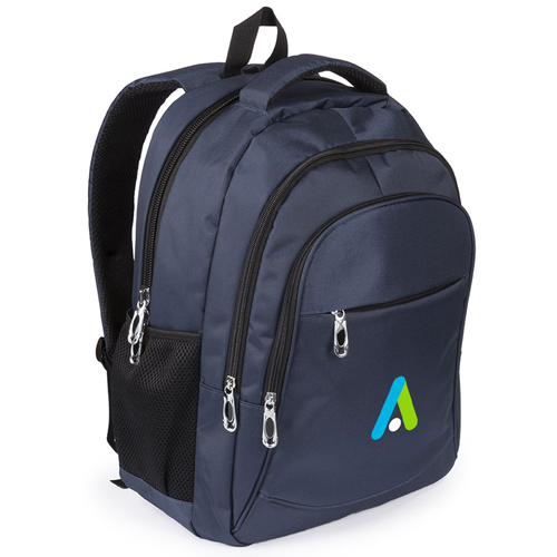 600D Nylon laptop rucksack with large zipped and padded main compartment for transporting your laptop safely, 3 zipped front storage pockets for all of your belongings, padded back, carry handle and shoulder straps for comfort. Suitable for use at work, school, university and travel. Features mesh side pockets for storing a water bottle or flask.