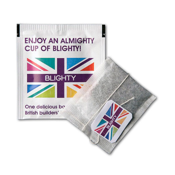Printed tea bag sachet. Loose packed tea bags with tags individually packed in a foil sachet.