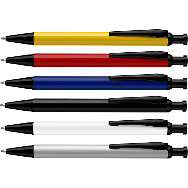 Belmont ballpen. Push action ballpen. Coated aluminium casing. Solid coloured barrel with black trim. Ink Colour: Black. Refillable. Bulk packed in boxes of 500