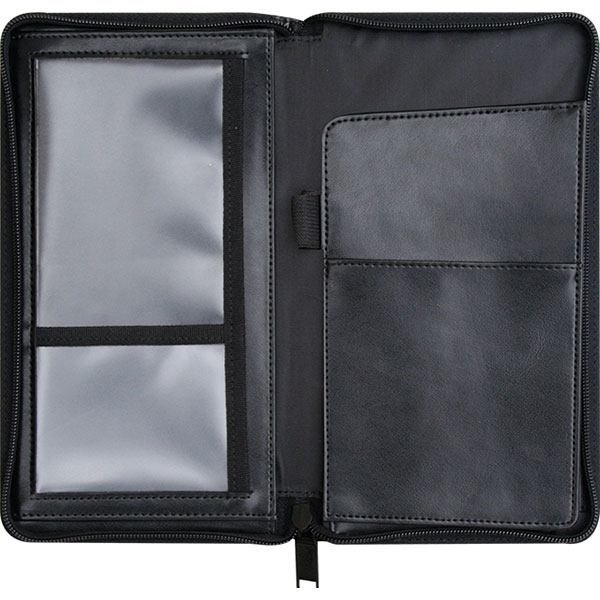 Leather travel document wallet. Genuine black leather. Zipped closure. Multiple pockets for storing all your travel documents.