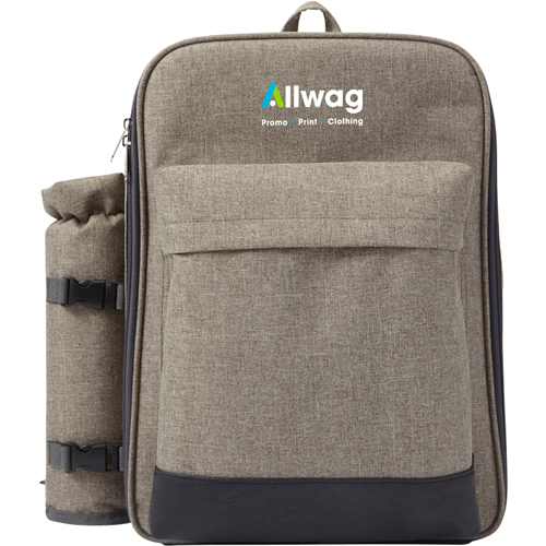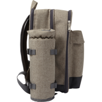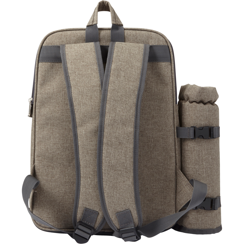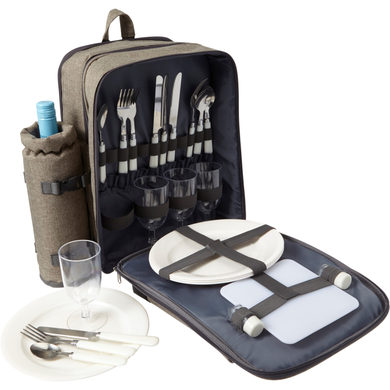 Polyester (600D) picnic rucksack with plastic cutlery for four people and a large cooling compartment. With an extra bottle holder and a set of salt and pepper shakers.