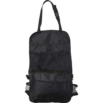 Foldable organizer (600D) for your car, with one large mesh front compartment, one small compartment for a water bottle and a zippered cooler compartment. Can be attached to a car seat.