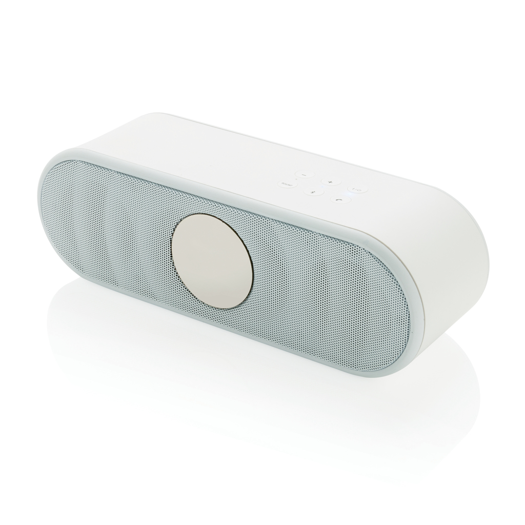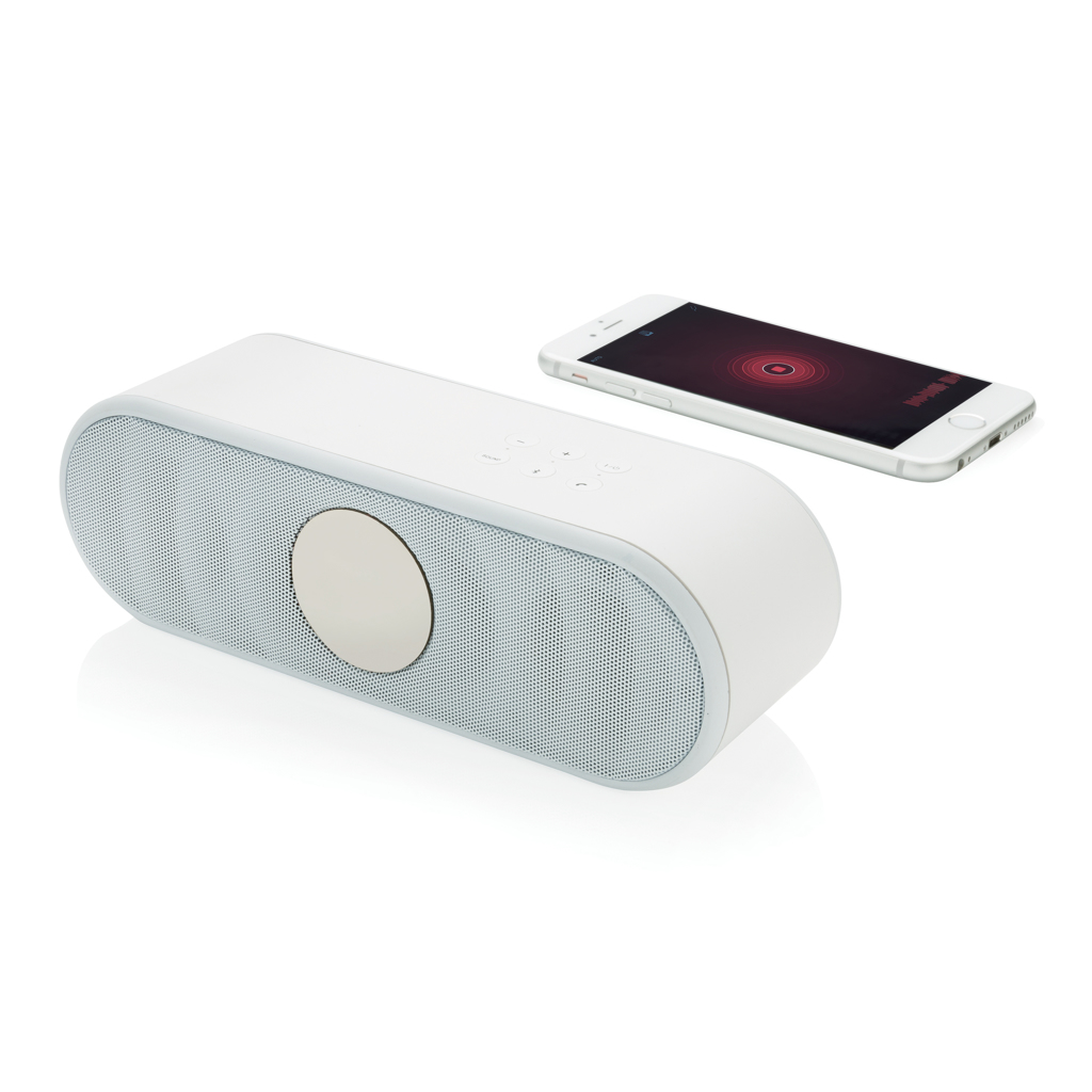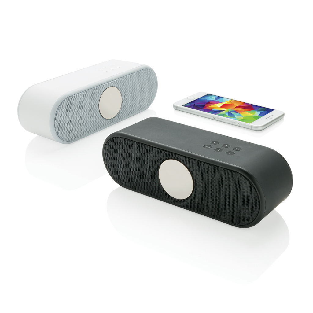 Stereo wireless speaker with rubber spray finish. With 6 buttons on the top for easy control of the speaker: volume +/-, call pick up, on/off and sound button to control the bass level for excellent sound. On the bottom there are two strips for optimal grip and sound quality. The battery has a capacity of 1200 mAh which enables you to listen in superb sound conditions for up to 10 hours. The item also has the option to be connected via a regular audio jack cable.