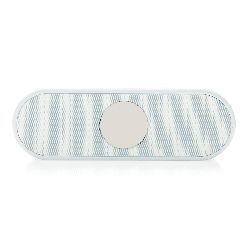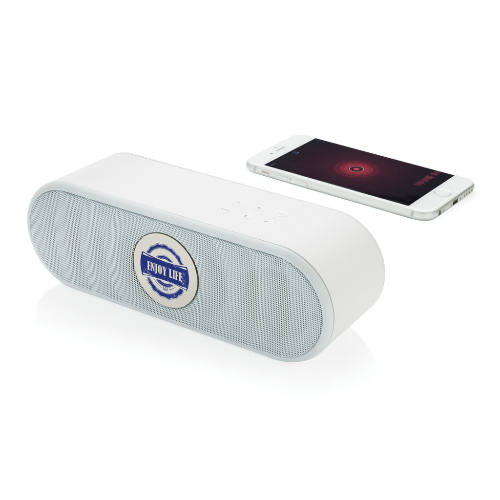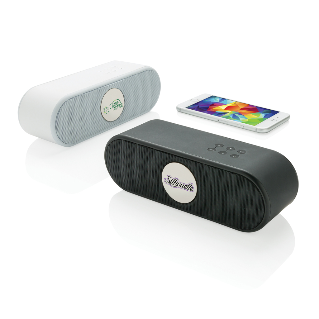 Stereo wireless speaker with rubber spray finish. With 6 buttons on the top for easy control of the speaker: volume +/-, call pick up, on/off and sound button to control the bass level for excellent sound. On the bottom there are two strips for optimal grip and sound quality. The battery has a capacity of 1200 mAh which enables you to listen in superb sound conditions for up to 10 hours. The item also has the option to be connected via a regular audio jack cable.