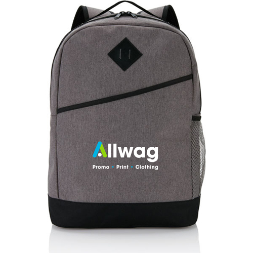 Modern 600D 2 tone polyester backpack with a zippered main compartment, a velcro front compartment, a side mesh pocket and adjustable padded shoulder straps. Air mesh padded back panel. PVC free.