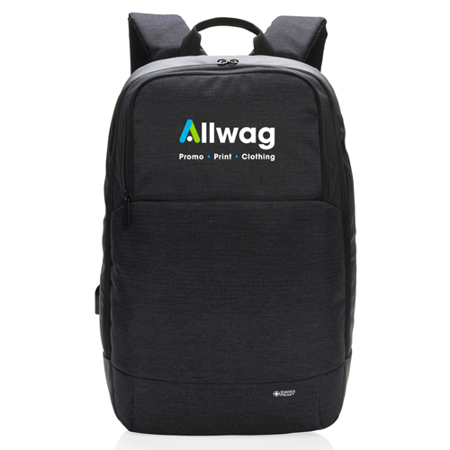 Fashionable 15 inch laptop backpack in two tone polyester with PU. Designed with one large main compartment for your laptop and one front compartment. Innovative handsfree suction system on the straps will hold your phone while commuting. Connect your powerbank easily to the integrated USB charging port and charge your phone or tablet on the go.