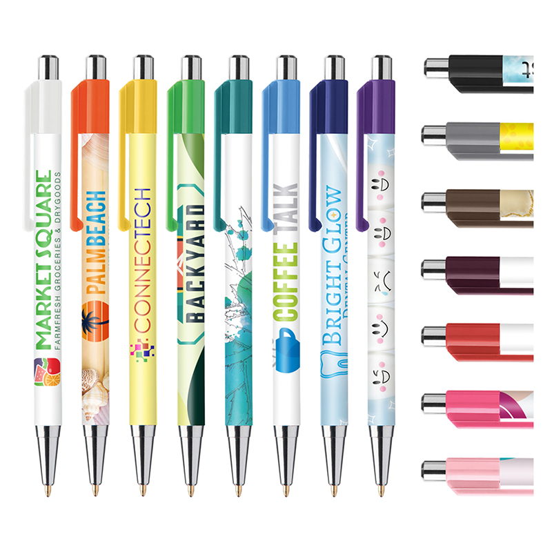 Slimline retractable ballpoint pen with coloured clip and glossy chrome trim. Promote your advertising message with full-colour branding, 360anddeg; around the barrel. The clip can also be printed digitally (ColourJet) to highlight a particular logo or message. Please note that the clip is moveable, allowing for a true 360andordm; branding area. Choice of blue or black writing ink.
