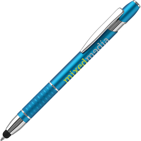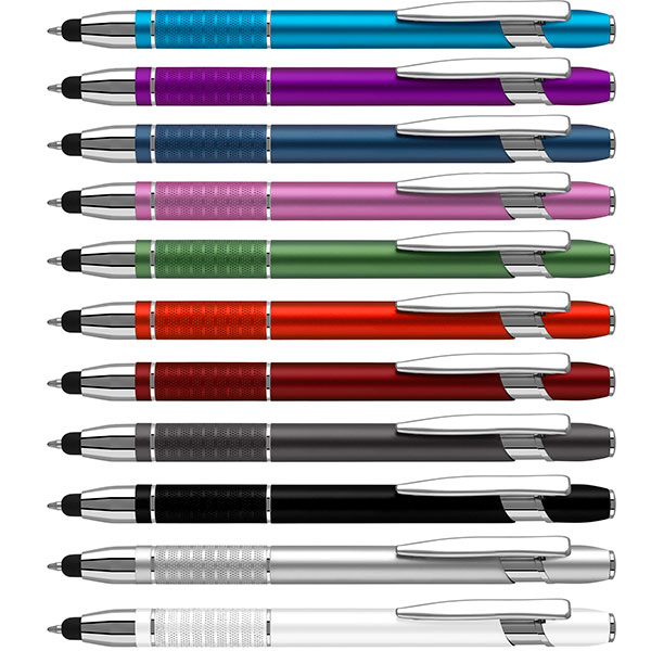 Bella touch ballpen. Button action. Coated aluminium casing. Touchscreen stylus. Chrome trim. Ink colour: Black ink. Refillable. Bulk packed in boxes of 500 pcs