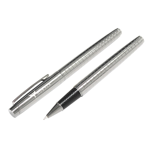 Exceptionally smart, professional and elegant, for extra brand gravitas. Pull off cap with shiny silver finish barrel and stylish grid effect pattern to outer barrel and cap. Black inner trim to nib. High quality black ink refill.