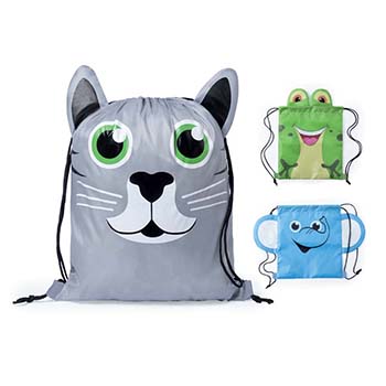 Polyester drawstring animal bag. Animal face detail printed on the front of the bag.