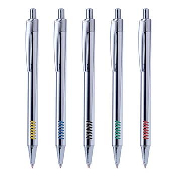 Chromed finished ballpoint pen with body in aluminium and eye-catching grip in a wide range of bright colours. Push-up mechanism, with jumbo cartridge and blue ink.