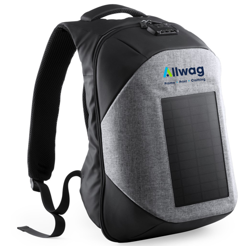 Backpack with integrated solar power panel in resistant 1200D nylon. Water repellent, with USB charging port -power bank not included- and security lock with password. Main compartment with double puller and inside padded pocket for notebooks or tablets up to 10 inches size. Shoulder and back straps with ergonomic padding.
