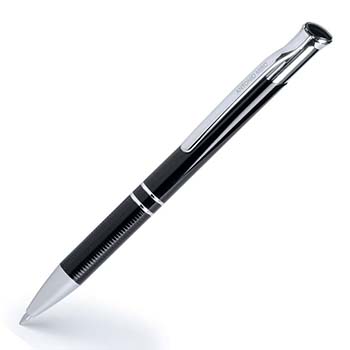 Black retractable glossy pen made from aluminium with a built-in slider clip. Individually boxed.
