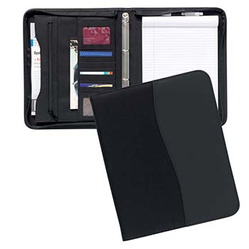 Zipped 600D Polyester A4 conference folder with 4 ring binder and various pockets. Accessories include writing pad and ballpoint pen. Great for travelling business executives and professionals.