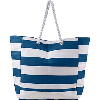 Cotton beach bag with white and coloured stripes with white cord handles and magnetic closure button on the inside.