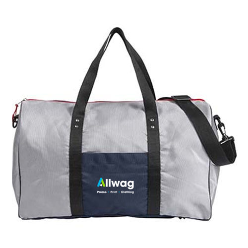 Polyester (210D) sports bag with carry handles and adjustable shoulder strap, which is padded. The bag has a front pocket and one large main compartment.