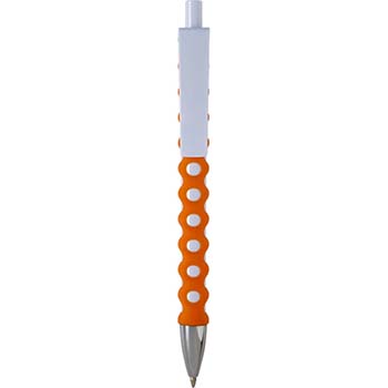 Plastic, white barrel ballpen, rubberized along the entire length in different colours, with cut-outs to show the white barrel. The pen has a blue refill and push button mechanism. The button and clip are white, the tip is silver.