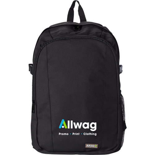 Polyester (600D) backpack with RFID blocker. The front pocket and main compartment have a zipper and several pockets in the interior, including a compartment for a laptop. Also has a mesh outer pocket at the side. The straps are padded and adjustable.