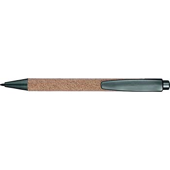 Ballpen with cork holder and plastic tip, clip and top with push button. Blue ink.