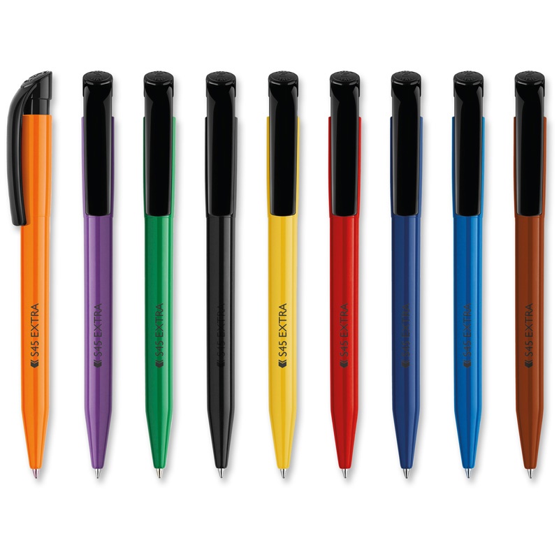 The S45 range features a futuristic design that maximises print exposure on both the barrel and clip. Developed to celebrate 45 years of manufacturing by Stilolinea, this pen combines affordability with functionality, offering smooth writing for over 2000 metres. It’s an excellent choice for promotional purposes.