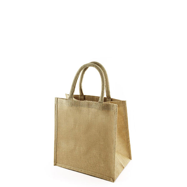 Green and Innocent laminated natural jute bag. Features gusset and short cotton cord handles.