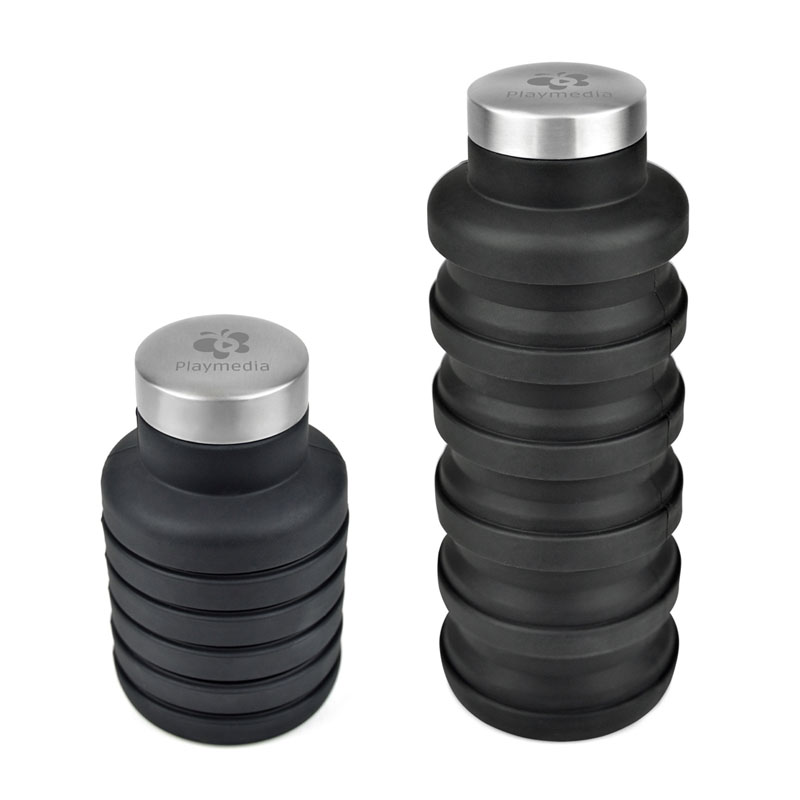 550ml single walled collapsible coloured silicone drinks bottle with stainless steel screw top lid. BPA & PVC free. Product can only be engraved.