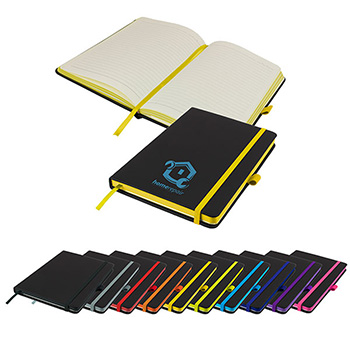 DeNiro Edge A5 notebook. Soft touch PU notebook. Black cover with contrasting ribbon, pen loop, elastic and page edges. 98 sheets of 70gsm ivory lined paper and rear pocket. The paper used in this product is from responsibly sourced wood from sustainably managed forests. This product can be printed a maximum of: 3 colours. Country of origin: China.