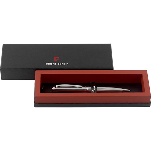 Pierre Cardin Lustrous chrome ballpen. Twist action metal ballpen. Hand finished chrome plated brass casing. Supplied in a Pierre Cardin gift box. Dokumental ink refill. Ink Colour: Black or Blue. Supplied in Pierre Cardin branded PB17 gift box or bulk packed in outer cartons of 200 units.