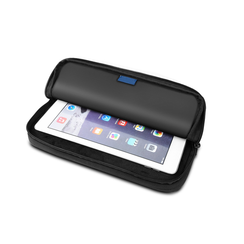 Water resistant RPET travel pouch to keep all tech safe and secure when travelling. Made from recycled bottles. Deep, faux fur, zipped pocket for iPads. Features zip pockets and straps with black handle.